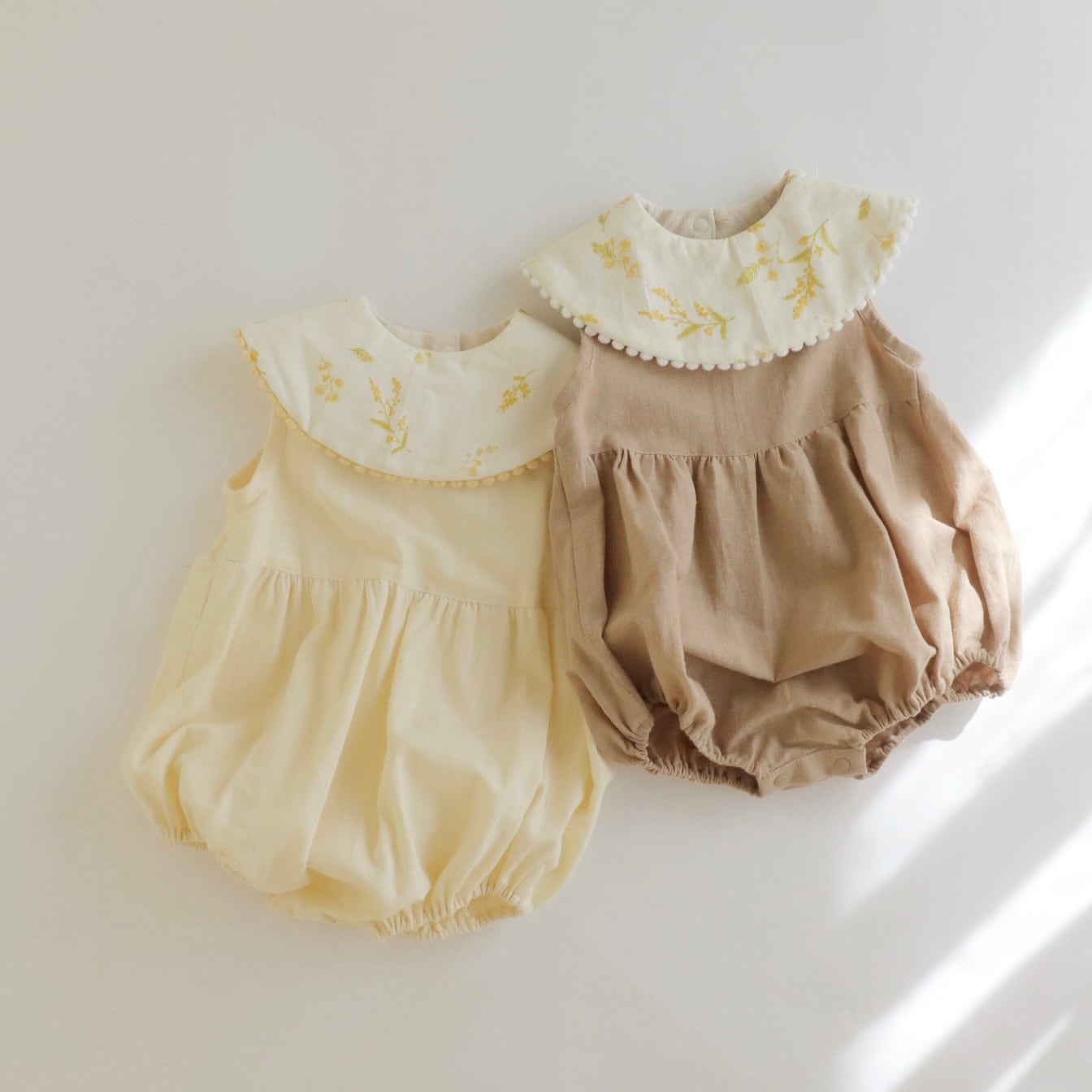 小さなイエローミモザ柄の春らしいベビースタイです。