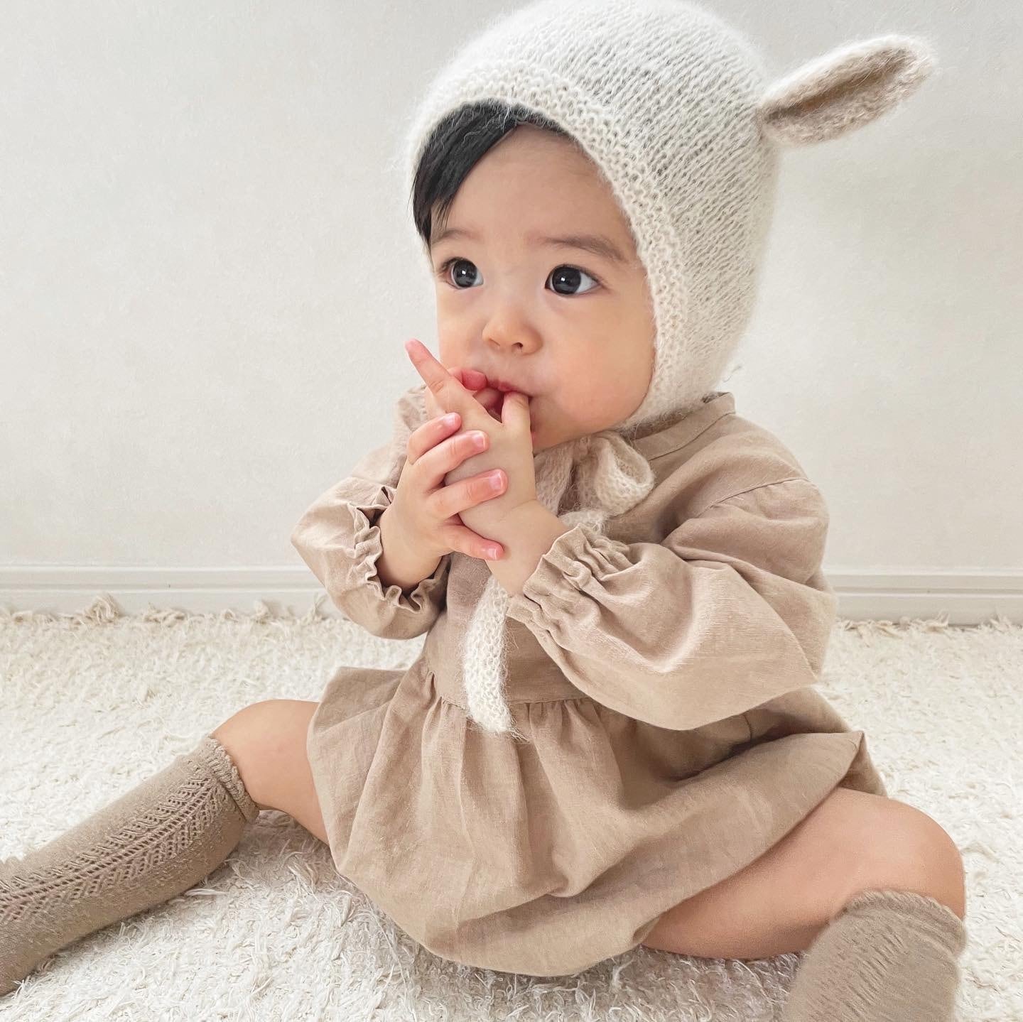 くしゅっとギャザーの寄った袖口から、ちょこんと出るおててが可愛い◎